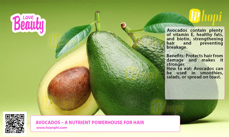 Avocados contain plenty of vitamin E, healthy fats, and biotin, strengthening hair and preventing breakage.